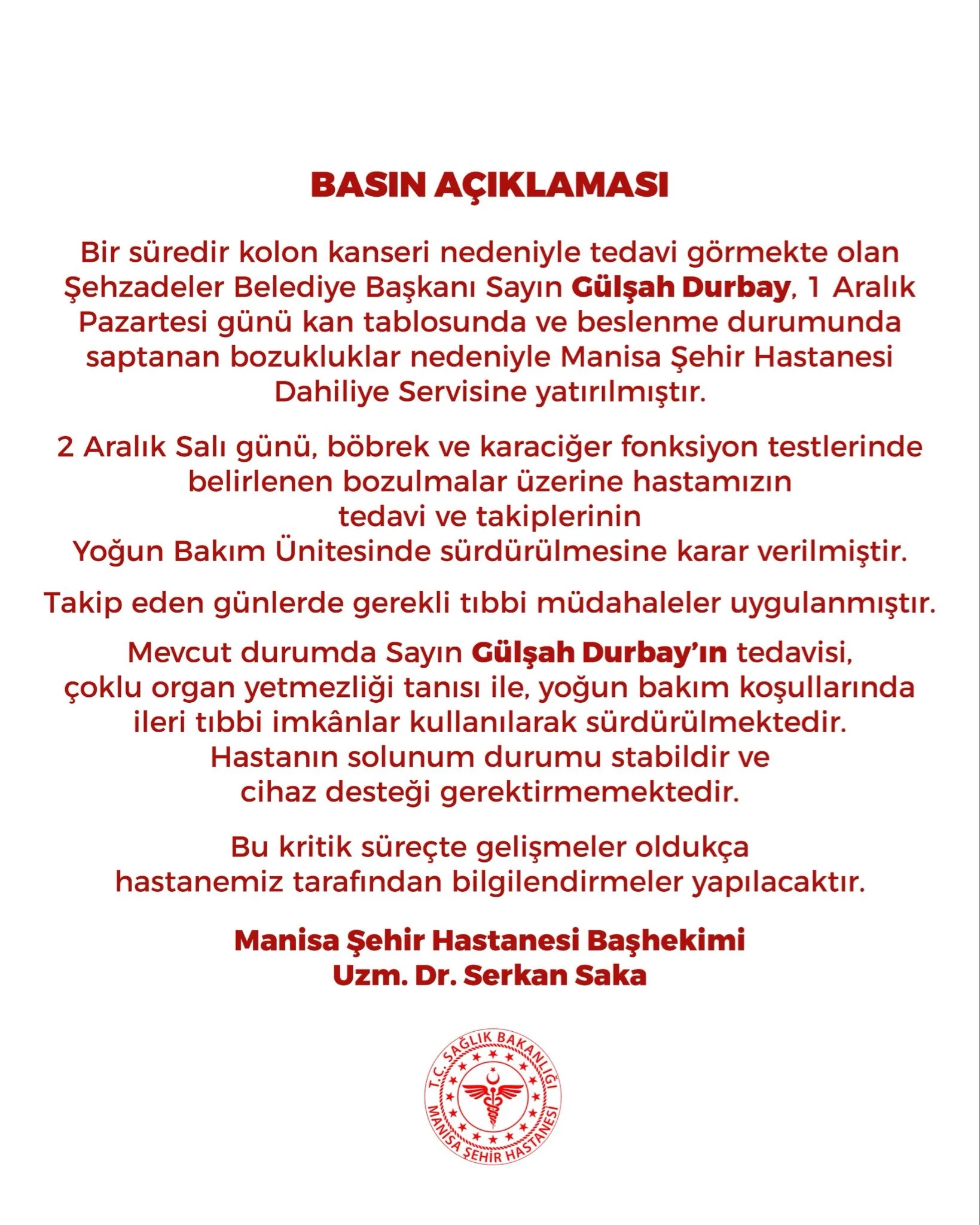 'Bir süredir kolon kanseri nedeniyle tedavi görmekte olan Şehzadeler Belediye Başkanı Sayın Gülşah Durbay, 1 Aralık Pazartesi günü kan tablosunda ve beslenme durumunda saptanan bozukluklar nedeniyle Manisa Şehir Hastanesi Dahiliye Servisine yatırılmıştır.