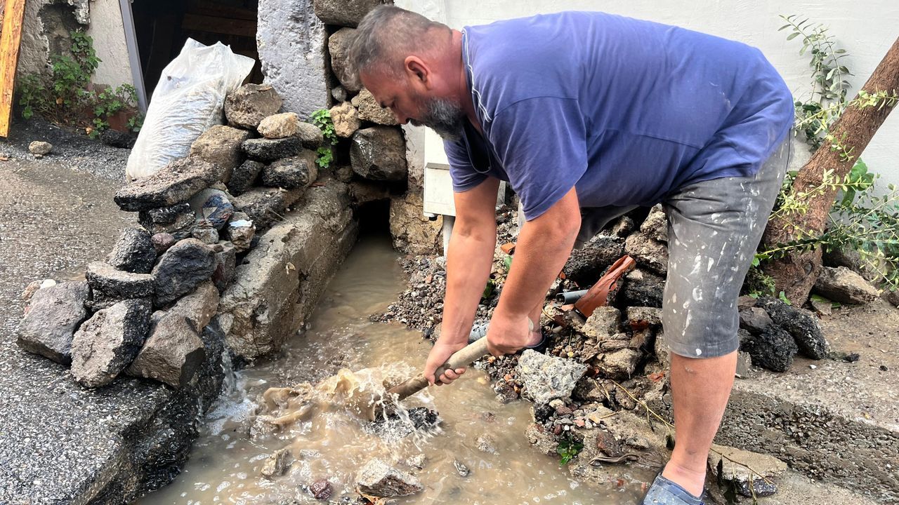 Yılmaz Çakmak: 'İzmir Gaz'ın çalışmaları yüzünden mağduruz. Gelip yapıyorlar, sonra öylece bırakıyorlar. Kapının önü tamamen dere yatağına dönmüş. Her yağmurda aynı şeyi yaşıyoruz.'
