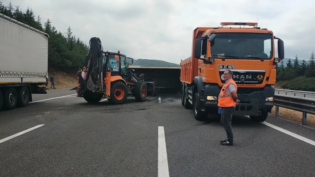 Henüz plakası ve sürücü kimliği belirlenemeyen kamyonun devrilmesi üzerine İstanbul istikameti trafiğe kapandı.