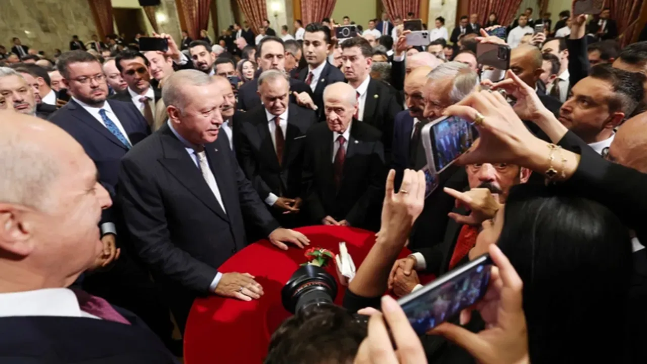 Cumhurbaşkanı Erdoğan, MHP Genel Başkanı Bahçeli'nin ve MHP'li milletvekillerinin bulunduğu, DEM Parti Eş Genel başkanları Bakırhan ve Hatimoğulları ile DEM Parti'li milletvekillerinin olduğu masaları ayrı ayrı ziyaret etti.