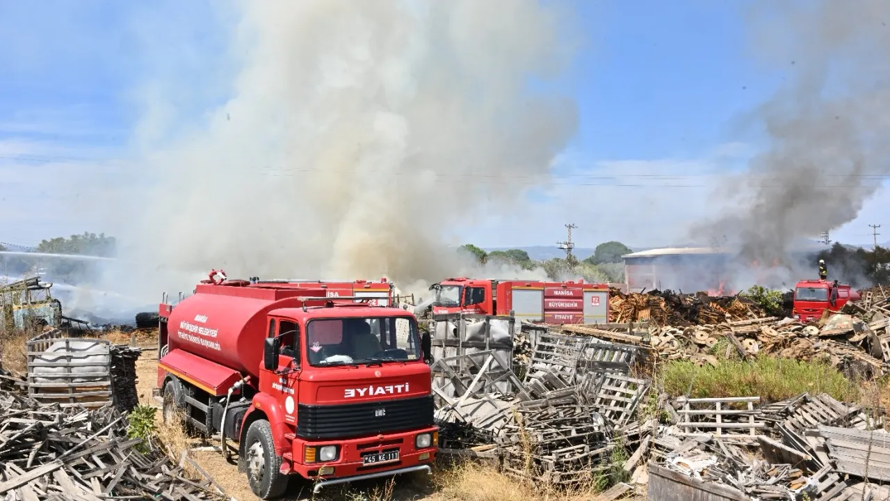 Manisa'da Muradiye Mahallesi’nde faaliyet gösteren ahşap palet fabrikasının depolama alanında yangın meydana geldi. Kontrol altına alınan yangın bölgesinde soğutma çalışmaları sürüyor.MANİSA (İGFA) - Manisa Büyükşehir Belediyesi İtfaiye Dairesi Başkanlığı ekipleri, Muradiye Mahallesi’ndeki ahşap palet fabrikasının depo alanında çıkan yangına müdahale edildi.