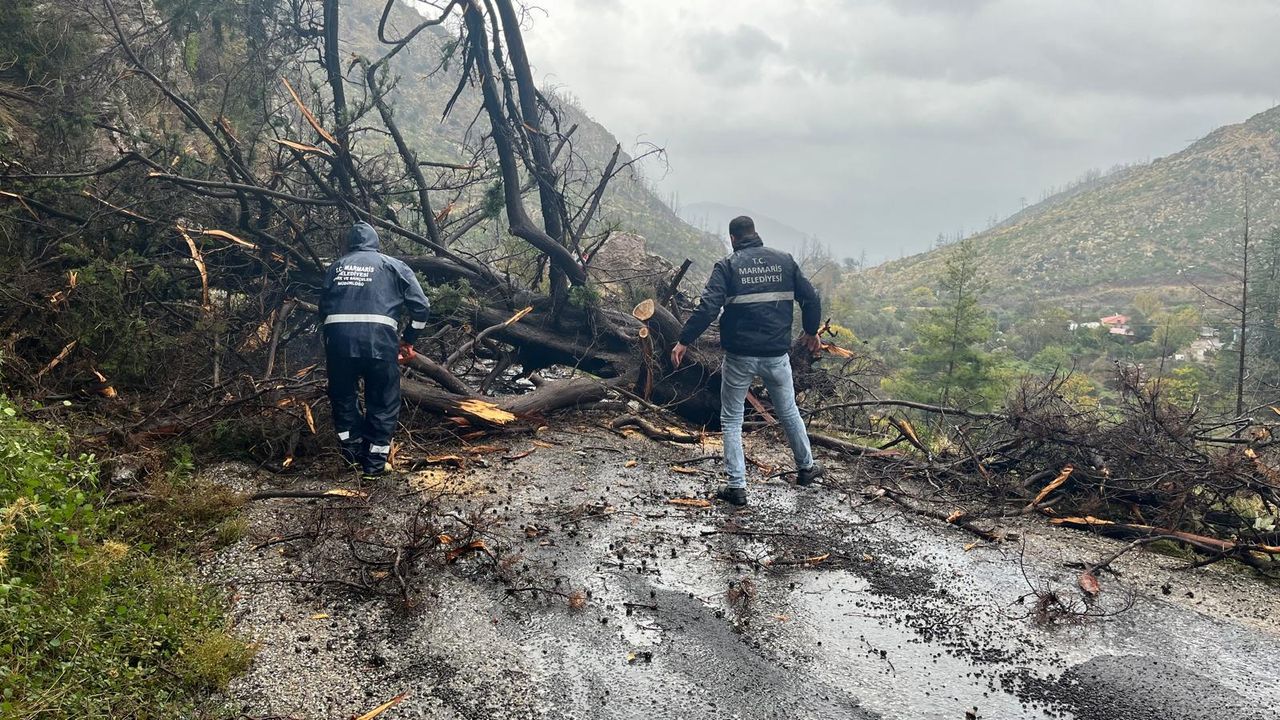 Yağmur nedeniyle yoğun mesai yapan Marmaris Belediyesi ekipleri olumsuzluk yaşanmaması için çaba harcıyor.
