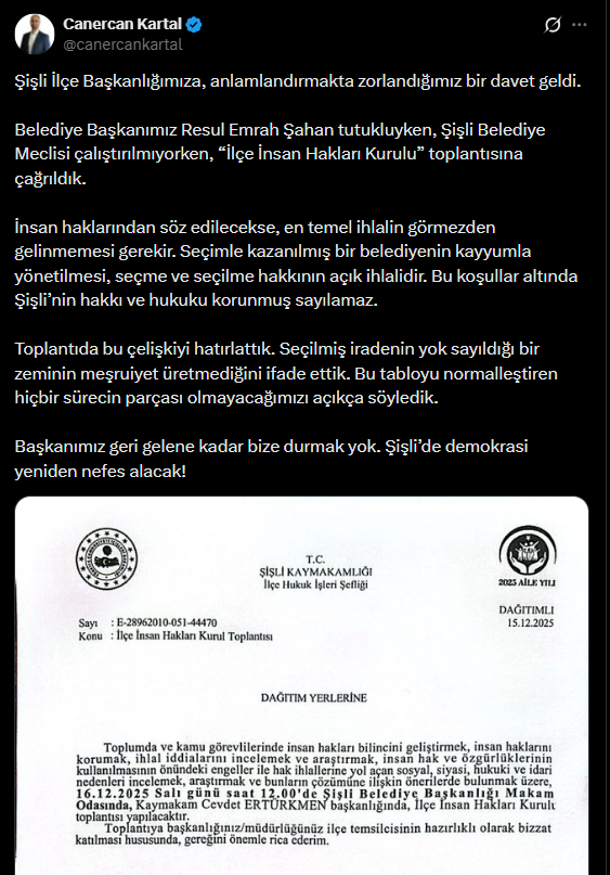 Şişli Belediyesi'nin kayyım başkanvekili ve Şişli Kaymakamı Türkmen'in davetini paylaşan CHP Şişli İlçe Başkanı Canercan Kartal, 'Şişli İlçe Başkanlığımıza, anlamlandırmakta zorlandığımız bir davet geldi.